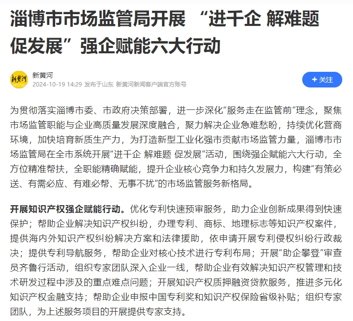 博山区市场监管局领导和职能科室负责人一行此次深入企业走访调研,重点针对企业生产经营过程中遇到的知识产权、品牌赋能、行车叉车特殊工种、计量器具检定、标准化创新等共60大类业务提供业务咨询和指导服务。