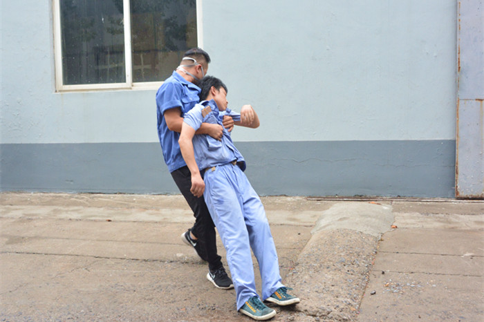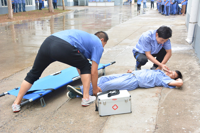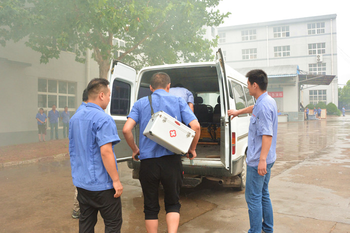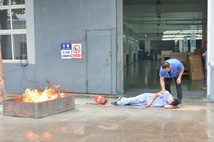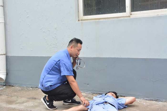 9:29,汇祥公司总成车间突然出现“火情”,第一发现人立即向车间内大声呼救“着火了”,随后使用灭火器进行灭火,车间内所有人员通过安全出口紧急疏散,救援小组迅速赶到现场,对受伤人员进行急救,消防小组迅速组织扑救,有效控制火情。疏散、救援、灭火、警戒同时紧张有序地进行,9:35,所有人员疏散至安全区域,伤员送往“医院”救治……